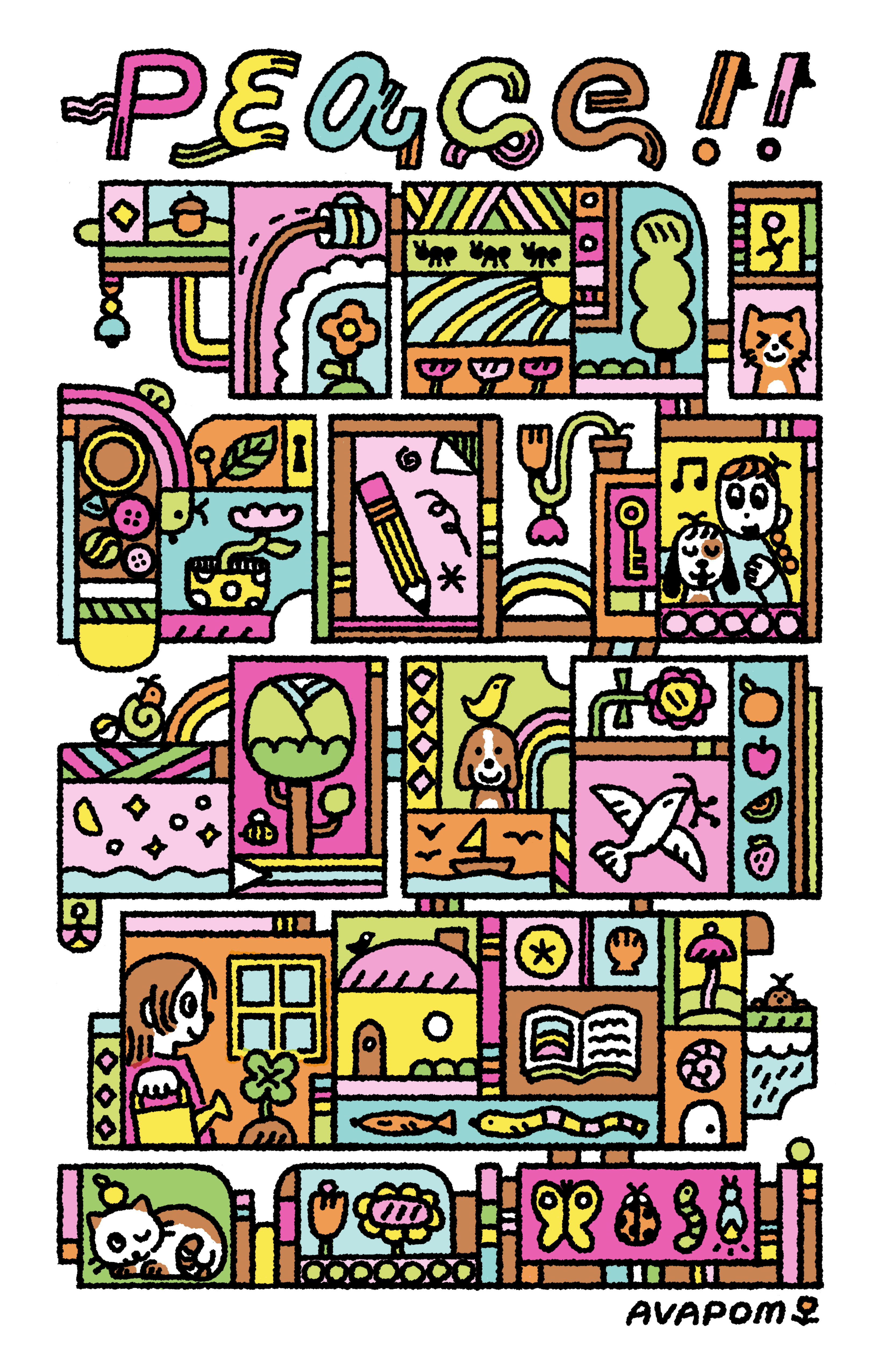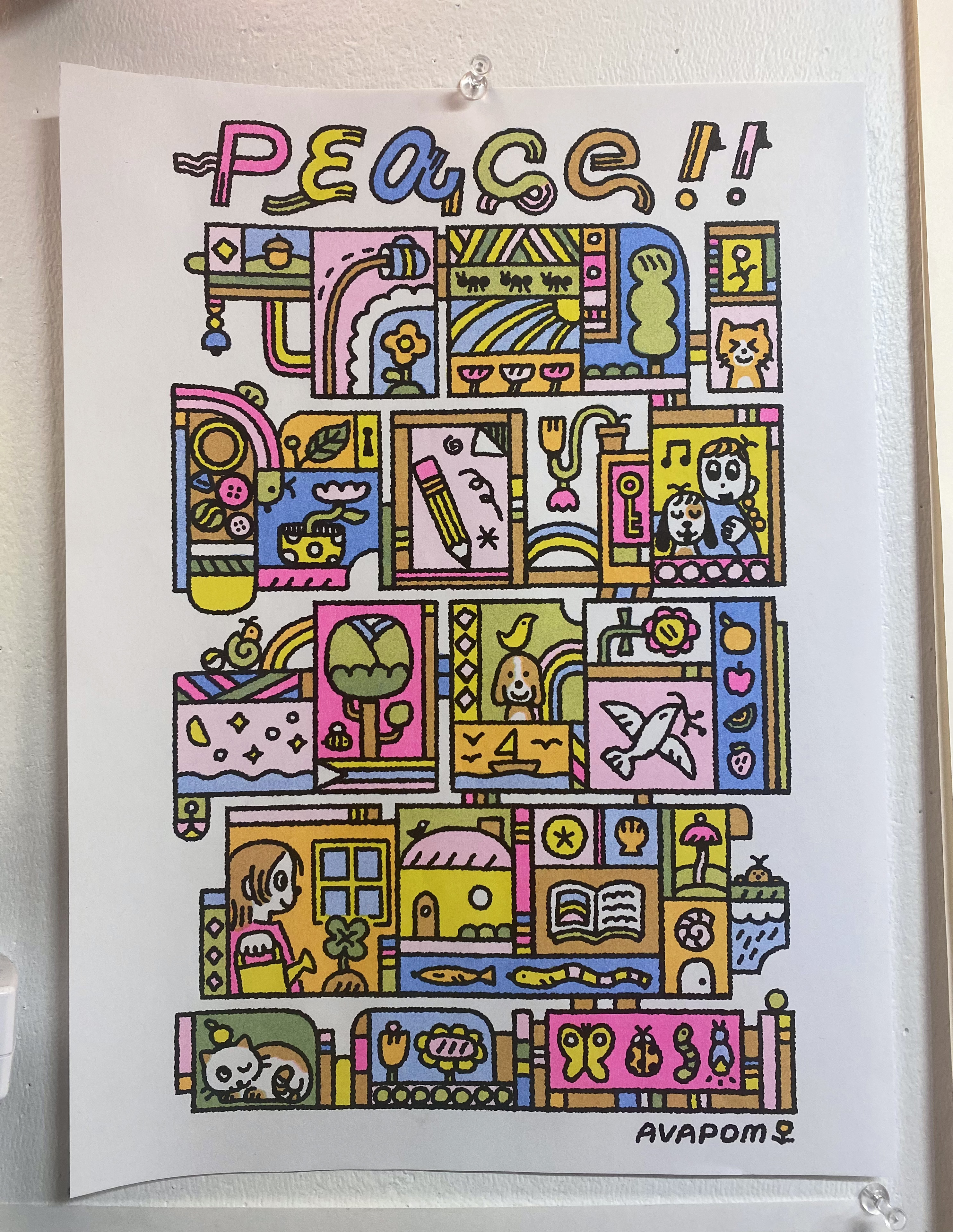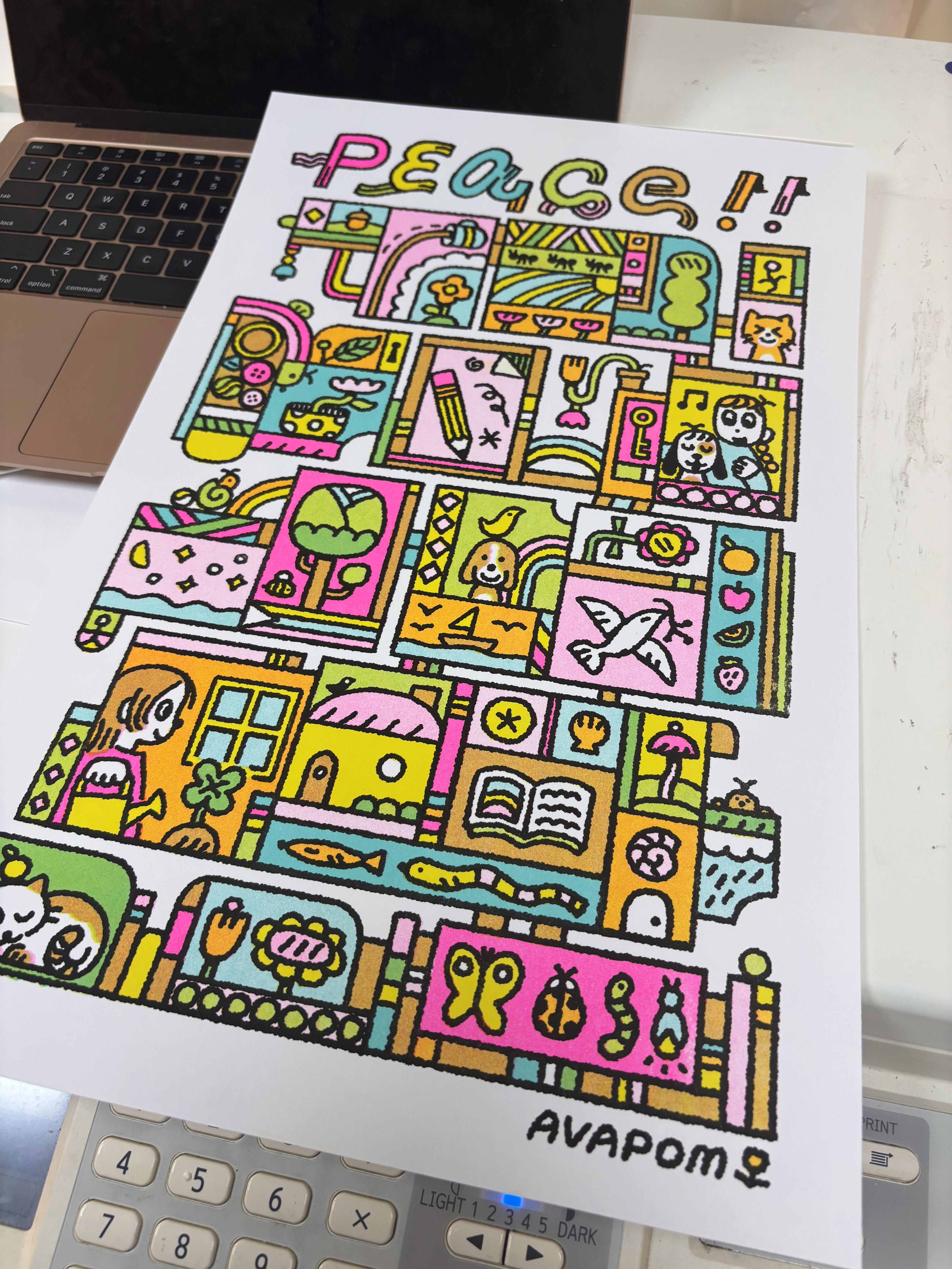 digital illustration and risograph printed poster in yellow, fluo pink, mint (V1) / cornflower blue (V2), and black (prints below)